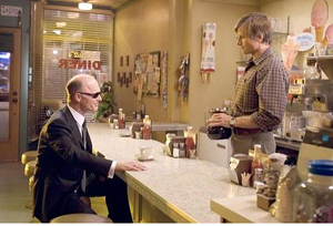 이렇게 평온한 일상이 이어지던 어느 날 흉악한 강도 두 명이 톰의 식당으로 찾아와서 행패를 부리기 시작한다. 톰은 이들에 맞서 싸우다가 총으로 둘을 쏴 죽이고, 갑자기 마을의 영웅으로 떠오르게 된다. 여기서부터 영화는 우리에게 익숙한 풍경을 보여준다. 이라크 전에서 미국이 수없이 만들어냈던 이미지들. 그러니까, 매스컴의 영웅 만들기. 정당방위와 마을수호라는 명목으로 이뤄진 대항폭력에 대한 칭송과 미화가 이어진다. 이유야 어찌되었건 사람 두 명을 과감하게 죽인 살인행위를 떠받드는 언론과 마을사람들의 태도는 이제 모종의 불편함을 자아낸다. 이건 뭔가 맞지 않다. 용감한 은행 여직원이 강도를 맨손으로 때려잡고 시민으로서의 도리를 다했다고 겸양을 떠는 상황이 아닌 것이다.