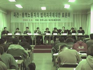 근로자파견법의 제정 이후 아웃소싱이니 외주화니 하며 불법파견이 급증하고 있는 상황에서 3월 8일 광화문 한글회관에서는 민주노총과 파견철폐공대위 주최로 <파견용역노동자의 법적 지위에 관한 토론회>가 열렸다. 80여명이 자리를 가득 채우고 4시간에 걸쳐 진행된 이 날 토론회는 파견·용역노동자들이 법적으로 보호받지 못하고 있는 현실을 사회적으로 고발하기 위해서 준비된 것이다. 즉, 불안한 고용상황으로 인해 저임금과 장시간 노동 그리고 정규직과의 극심한 차별을 받고 있지만 최소한 법에 보장된 권리마저도 해석상 그리고 집행상 보호받지 못하고 있는 현실들을 알려내기 위한 것이었다. 비정규직 노동자들 40여명을 비롯한 민주노총 서울본부와 노무사들의 많은 관심속에 토론회는 시작되었다.