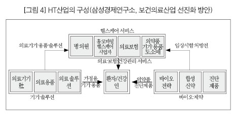이러한 기업들의 움직임은 향후 보건의료체계를 어떻게 변화시킬까? 지난 8월 삼성경제연구소가 정부에 제출한 ‘보건의료산업 선진화 방안’ 보고서에서 큰 그림을 볼 수 있다. 이 보고서는 HT(보건의료 기술)라는 개념을 제시하는데, 이것은 삼성이 관심을 가지고 있는 바이오 제약 산업, 의료기기 산업과 유헬스를 포함한 의료서비스 산업을 모두 포괄하고 있다. HT산업 선진화를 위해 정부 차원의 대규모 R&D를 요구하는 이 보고서는 이미 의료서비스의 미래 트렌드로 글로벌 체인화 된 영리병원을 제시하면서 의료민영화를 기정사실화하고 있다. 또한 아직까지 공적 체계가 마련되어 있지 않고 기준도 정해지지 않은 원격의료시장, 건강관리서비스 시장으로 진출해서 더욱 포괄적인 의료민영화를 추구하고 있다. 현재와 같은 추세라면 보건의료체계가 삼성의 이윤과 사업계획에 종속되는 경향이 더욱 심화될 것이다. 지금까지 삼성병원과 삼성생명이 영리병원과 건강보험 민영화로 대표되는 의료민영화를 요구했다면, 앞으로는 의료기기, 정보통신 산업에 진출한 삼성전자와 향후 진출하게 될 삼성 계열 바이오 제약회사가 수직적으로 결합되어 예방, 건강증진을 포함하는 더 넓은 범위의 의료민영화를 추진하게 될 것이다. 이것을 삼성경제연구소는 ‘보건의료산업 선진화’라 부르고 있다.