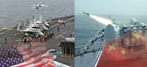 2009년 10월 서해상에서 실시된 한·미 연합 훈련에 참가한 미국 항공모함 조지 워싱턴 호(왼쪽). 오른쪽은 최근 실시된 해상 훈련 도중 미사일을 발사하고 있는 중국 군함.