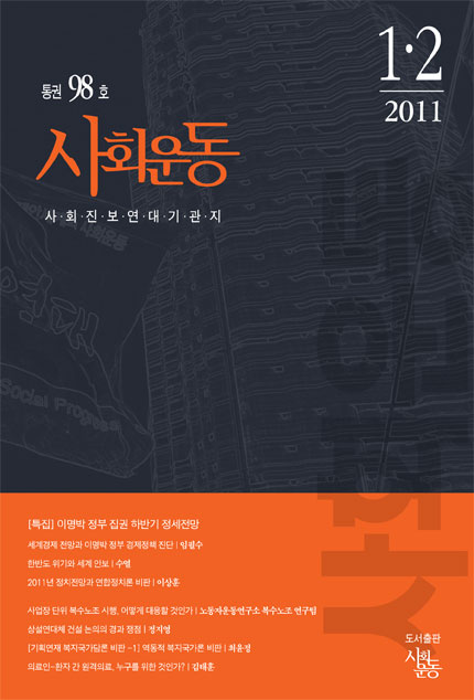 2011.1-2.98호 프린트 사회운동 2011년 1-2월호 통권 98호 표지 정책위원회 | 사회운동 2011년 1-2월호 통권 98호 표지 주제어 태그 Twitter Facebook Katalk Me2Day