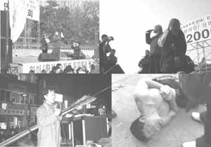 작년 11월 투쟁현장에 갖는데 적들과 대치했어요. 안에는 회사구사대들, 경찰 고위관계자들이 있었지요. 앞에는 방패막이 전경들이 있었구요. 이들을 뚫지 않으면 우리가 목표하는 곳을 갈 수가 없었습니다. 그래서 그 자리에서 저는 선동을 했지요. 뚫어야 한다. 그럴러면 모두가 힘을 모아야 한다고.. 그래서 *** 조합원들이 '그러자'하면서 뚫은 거예요. 방패도 빼앗고, 전경도 끌어내고 하면서요. 근데 그 집회를 준비했던 임원 한사람이 그러는거에요 "돌려보내, 돌려보내 전경은 우리의 적이 아냐. 우리는 그들과 싸울려는게 아냐 돌려보내, 돌려보내" 하는거에요.