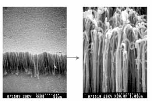 나노기술 중 주목받는 또 하나의 기술은 탄소나노튜브기술이다. 그림 3에서 보듯이 콩나물 모양으로 불규칙하게 성장해있는 줄기들이 나노 튜브이다.