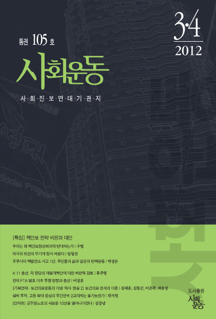 2012.3-4.105호 프린트 <<사회운동>> 통권 105호(2012년 3-4월호) 표지 정책위원회 | <<사회운동>> 통권 105호(2012년 3-4월호) 표지 주제어 태그 Twitter Facebook Katalk Me2Day
