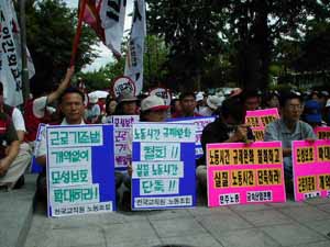 통계청에 따르면, 2000년 한 해 남한 전체 노동인구의 42%가 여성이고 69.7%가 비정규직이다. 같은 해 남성은 전체 노동인구의 58%이고 이 중 40.8%가 비정규직이다. 정규직 노동자의 74%가 남성이지만, 비정규직에서는 오히려 여성이 54%이다. 1999년, 여성은 남성과 거의 같은 시간(남성 48.2시간, 여성 47.3시간) 노동을 하고도, 임금은 남성의 64%수준(남성 137만원, 여성 87만원)에 불과하다. 상대적으로 임금이 낮은 직종인 서비스근로자 및 상점과 시장판매근로직에서 여성의 비율은 남성에 비해 1.5배(남성 1,963 천명, 여성 3,074 천명)가 넘는다. 성별 실업률의 차이가 없음에도 불구하고, 얼마 되지도 않는 실업급여의 분배비율을 보면 2000년 한해 남성이 68%, 여성이 32%이다.