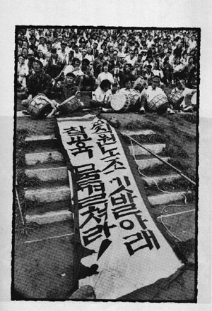 지난 6월 24일, 가차없이 내리는 빗속에서 열린 '귀족학교 저지와 7차교육과정 철폐를 위한 전국교사대회'. 이 대회에서 전교조 지도부는 결연한 모습으로 하반기 총력투쟁 결의를 제출하였다. 총력투쟁의 방법은 다름 아닌 "파업"! 이에 교수노조준비위에서도 교육주체총파업 결의로 화답하였다. 이는 집회 때마다 등장하곤 하는 자기만족에 겨운 일회성 발언은 결코 아니었다. 더 이상 신자유주의의 야만적 행위를 그냥 두지 않겠다는, 스러져가는 이 땅의 공교육을 반드시 살리겠다는 비장한 실천적 의지가 담겨져 있었다. 먹구름 속에서 후두둑후두둑 비가 내리는 가운데 치러진 대회에서, 전국에서 모인 수천명의 전교조조합원들은 예상을 뛰어넘은 지도부의 파업결의에 일순 당혹해 하면서도 우리의 길이 그것뿐임을 이내 공유했고 차츰 지도부와 하나되기 시작했다.