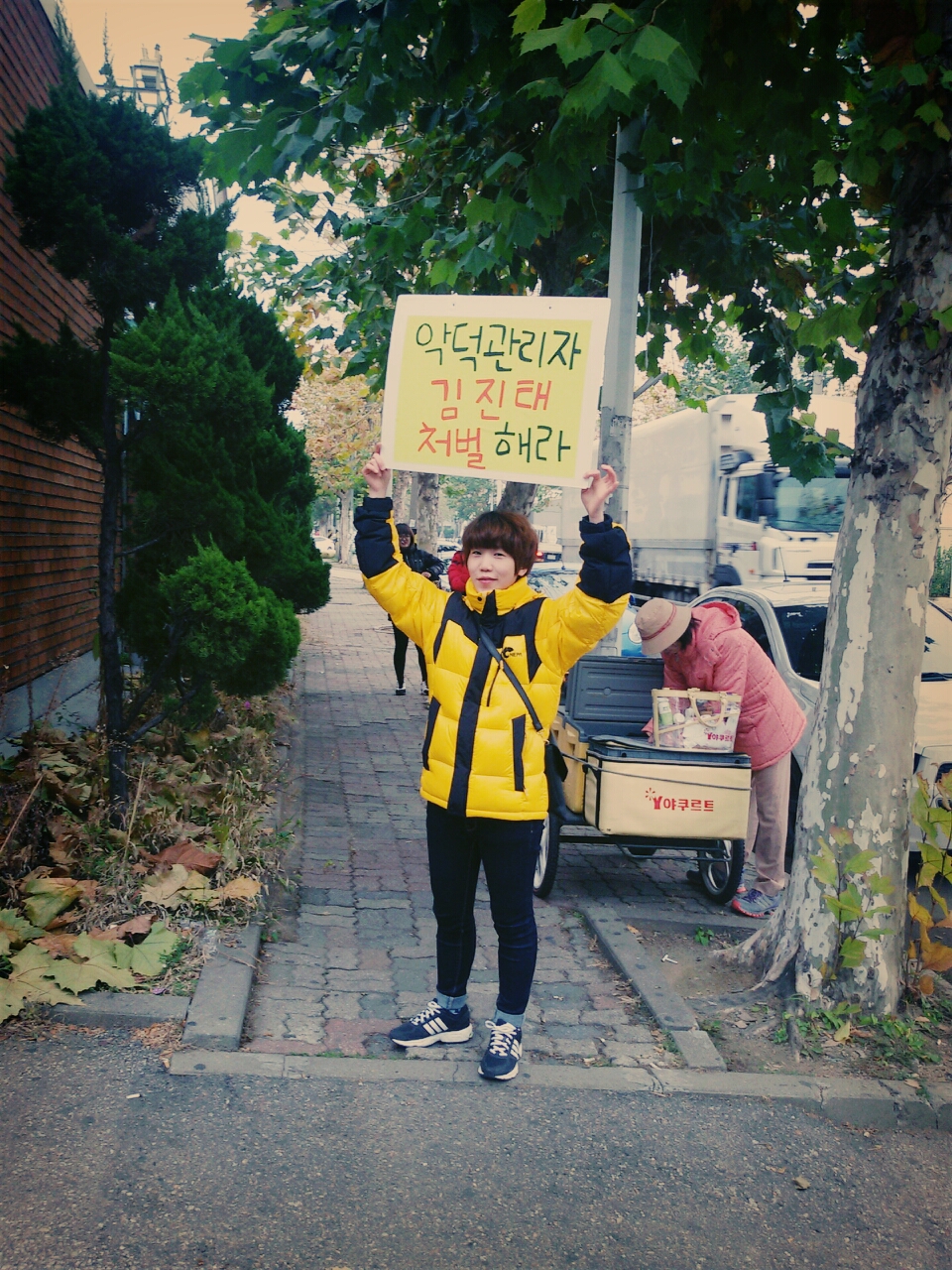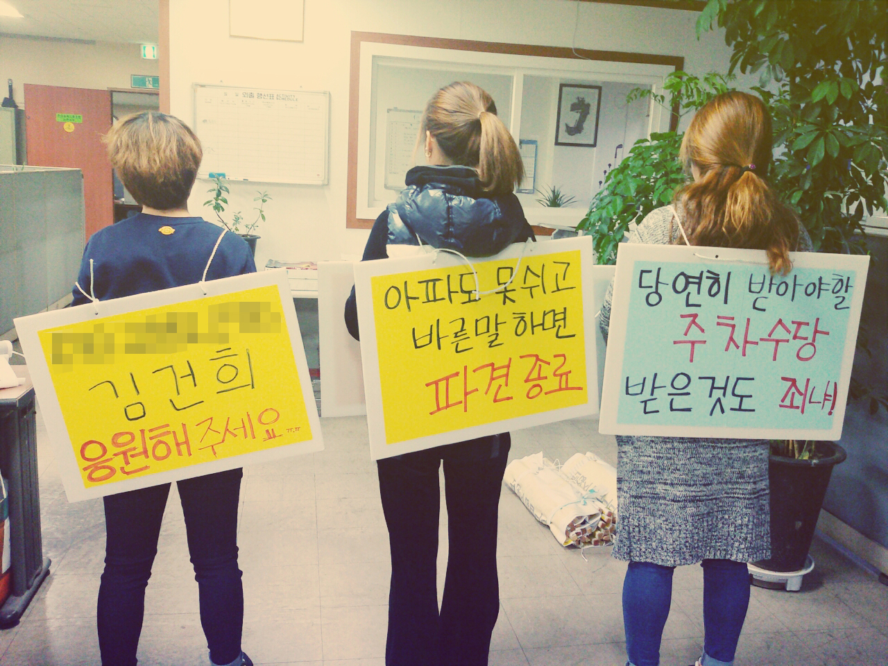 11월 3일, 첫 번째 유인물은 왜 이렇게 시위를 하게 되었는지 깨알 같이 쓴 손 편지였다. 직접 쓴 피켓도 만들었다. 그림도 그렸다. 그러자 놀라서 달려온 파견업체 직원이 몰려와서 피켓을 빼앗아가기도 하고, 회사는 CCTV를 설치하고 쓰레기통을 놓고 회사에 들어가는 노동자들에게 유인물을 빼앗았다. 하지만 굴하지 않았다. 응원의 문자가 쏟아지고, 유인물을 안 빼앗기려고 사람들은 받자마자 주머니에 쑤셔 넣고 내놓지 않았다. 회사 안에서 함께 일하던 동료이자 딸 같은 그녀들을 본 회사 언니들은 돌아서서 눈물을 훔치기도 했다. 회사 주변의 청소노동자도, 야쿠르트 아줌마도 그녀들을 응원했다.