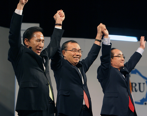 이명박 후보와 김진홍 뉴라이트전국연합 상임의장이 만세를 부르고 있다.
