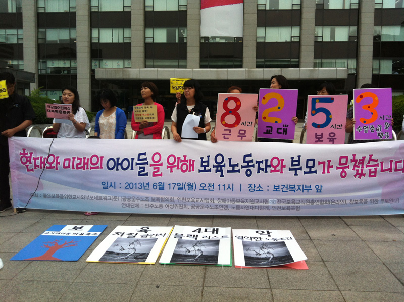 2013년 국가인권위 조사에 따르면 보육노동자의 1일 평균 근무시간은 9.6시간이며, 91.6퍼센트의 보육노동자가 휴게시간을 사용할 수 없다고 답했다. 쉬지 못하고 장시간 근무를 하는 것이다.