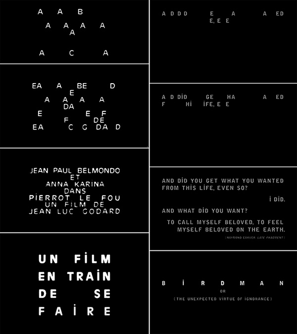 영화 <버드맨>은 삶이 과연 비극인지 아니면 해피엔딩일 수 있는지 판가름 내릴 수 없도록 모호하게 끝난다. 그 앞과 뒤에 무언지 모를 사물, ‘새’의 추락이 있다. 동시에 영화의 앞과 뒤에 ‘모던 영화의 아버지’ 장 뤽 고다르를 연상시키는 타이포그래피 크레딧이 오르내린다. 이런 것들은 영화의 내용과는 별 연관이 없지만 이미지를 통해 감각적인 충돌을 일으킨다는 점에서 타당한 측면을 갖고 있다.