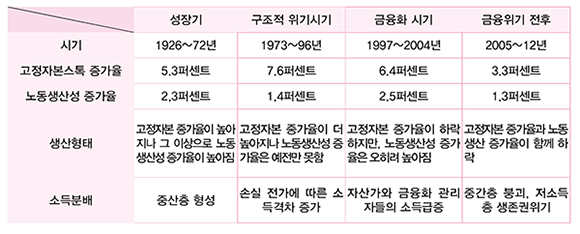 최근 미국 경제성장률이 조금 나아지자 경제위기 회복을 이야기하는 사람도 있지만, 앞의 표에서 볼 수 있듯이 지금의 미국 경제는 성장과는 한참 거리가 멀다. 지금의 미국 경제는 노동생산성 증가율도 줄고 고정자본 증가율도 주는, 말 그대로 마르크스가 이야기했던 자본이 축소재생산으로 진입하는 모습에 가깝다. 2006년부터 2012년까지 고정자본 증가율과 노동생산성 증가율 모두 기존의 절반으로 뚝 떨어진 상태다. 일찍이 이 양자가 동시에 줄어드는 상태가 긴 기간에 걸쳐 지속된 적은 없었다.