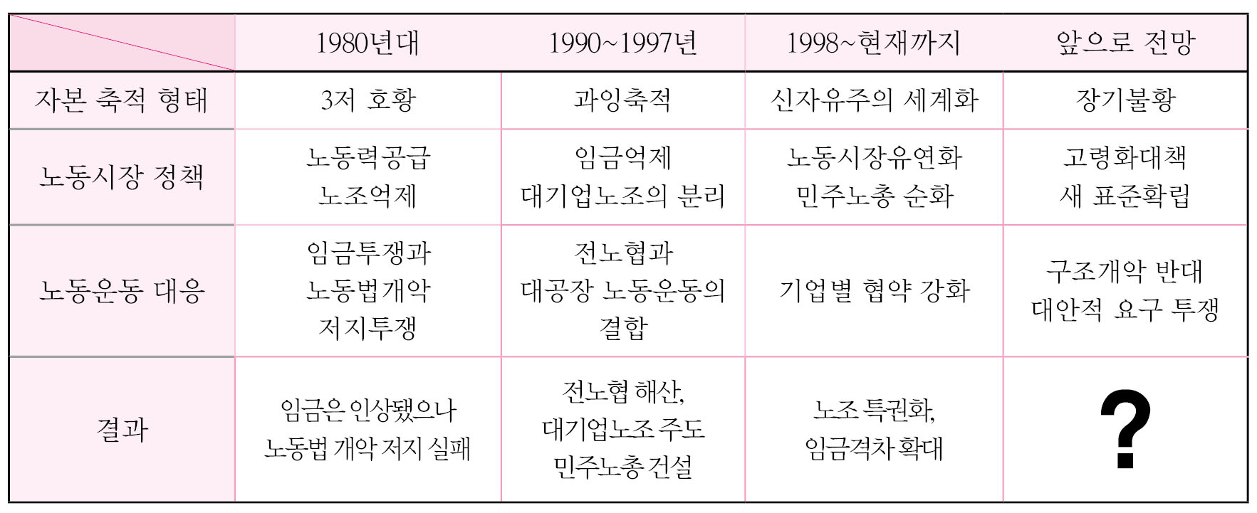 한국의 노동시장 정책은 철저하게 자본의 필요에 부응하는 것이었다. 특히 우리나라는 수출대기업 중심 경제인 탓에 재벌의 요구가 정부를 통해 제도로 곧바로 확립되었다. 정부는 초기업노조가 아닌 기업별 노조를 강제했고, 대기업 노동운동이 체제에 도전하는 급진적 노동운동과 결합하지 못하도록 막았으며, 노동시장 유연화를 밀어붙이며 지불능력 되는 사업장의 힘 센 노조만 살아남도록 노동시장 환경을 만들었다. 그리고 최근 노동시장 구조개혁으로 마지막 울타리마저 부숴 1987년의 흔적을 완전히 지운 새로운 표준을 만들려고 한다. 민주노조운동은 1987년 이래 투쟁을 멈추지 않았지만 결과적으로 자본의 전략을 거스르진 못했다.