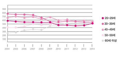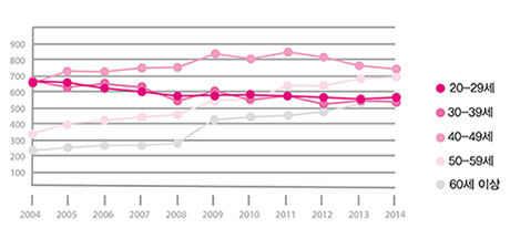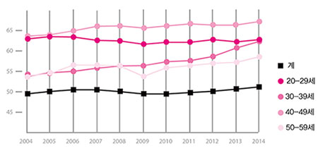 무수한 여성인력 활용 정책들에도 불구하고 지난 10년 사이 여성 경제활동참가율은 49.9퍼센트에서 51.3퍼센트로 소폭 상승하는 데 그쳤다. 그러나 50대 여성의 경제활동참가율은 무려 9.1퍼센트나 올라 20대에 근접했다(<그림 1>).