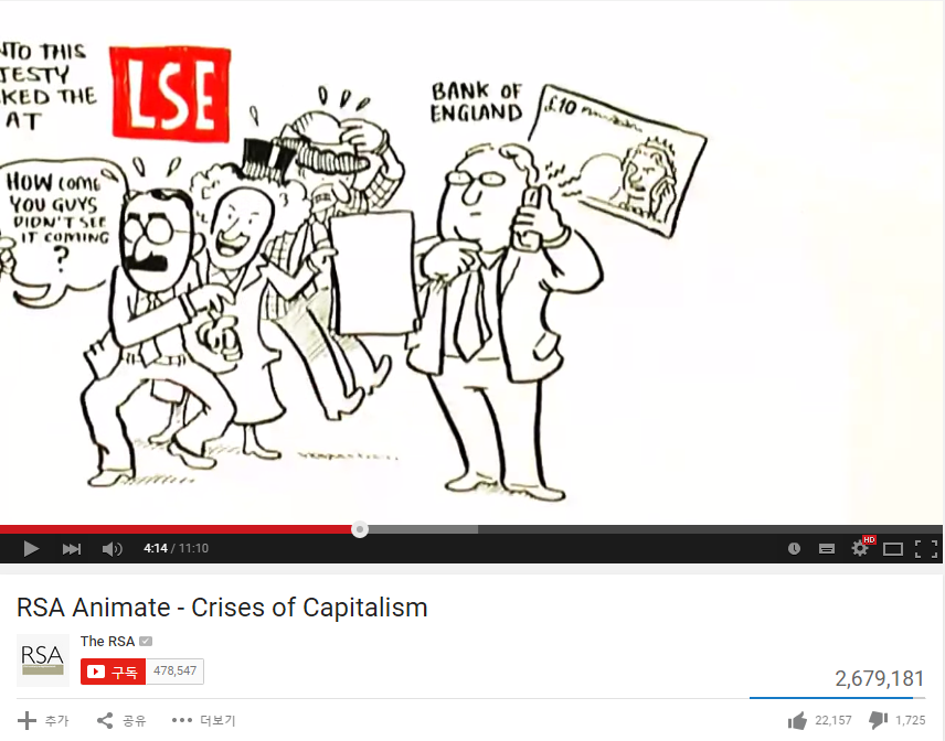 지젝의 영상은 자신의 저작 《처음엔 비극으로, 다음엔 희극으로》에 대한 강연 중 일부를 따와 애니메이션화한 것이고, 하비 역시 자신의 숱한 강연 중 일부를 “자본주의 위기"라는 제목으로 요약한 것이다. 제레미 리프킨 등 국내에 꽤 알려진 작가나 학자들의 강연도 있다.