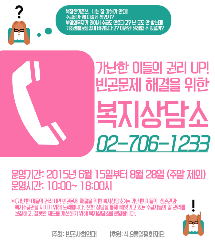 7월 1일, ‘세 모녀 법’ 이라는 기초생활보장법 개정안이 시행된다. 15년만의 대개정, ‘세 모녀 법’ 이라는 이름에도 불구하고 여전히 세 모녀는 단 한가지의 급여도 보장받을 수 없다. 그럴듯한 포장 뒤엔 개선되지 않은 과제와 최소한의 권리성이 파괴될 위험성이 숨어있다. 빈곤사회연대는 6월부터 8월까지 3개월간 수급상담전화 운영과 거리상담, 수급신청운동, 이의신청운동을 진행한다. 제도의 변화를 빌미로 나타나는 수급권자들의 권리 파괴를 방어하고, 제도의 한계를 구체적으로 밝히는 과정이 될 것이다.