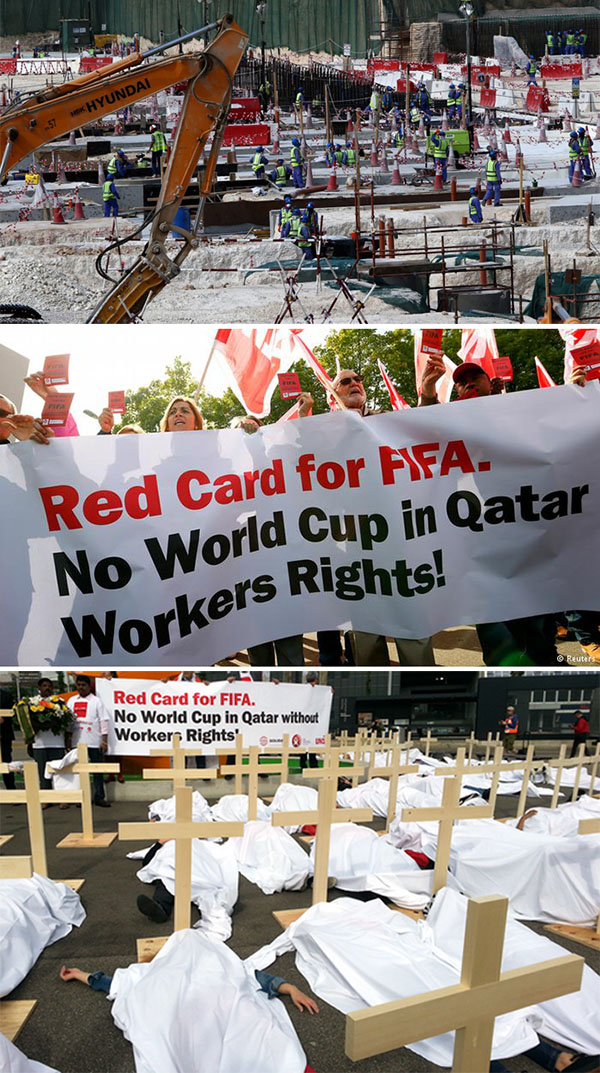 그날 총회가 열린 취리히 할레스타디온 밖에서는 비록 블라터 재선만큼 언론의 주목을 받지는 못했지만 의미 있는 행사가 벌어지고 있었다. 총회장 앞 공터에서 세계 각국의 노동조합 활동가 100여 명은 준비해온 나무 십자가를 머리맡에 두고 흰 천을 뒤집어쓰고 가만히 누웠다. 이 퍼포먼스는 카타르에서 월드컵 경기장이나 부대시설, 고속도로, 사회 기반시설 등을 건설하다 목숨을 잃은 1400여 명의 이주노동자를 상징하는 것이었다. 변변한 스포츠 시설 하나 없는 카타르에서 월드컵을 치르기 위해서는 3개 경기장 보수, 9개의 경기장 신축 등 각종 건물과 시설을 건설해야 한다. 이를 위해 일하는 이주노동자가 140만 명에 달한다. 이들은 주로 네팔, 스리랑카, 인도 등 서남아시아 출신으로 한낮이면 기온이 40도를 넘는 카타르에서 가운데 장시간 노동을 하고 있다.