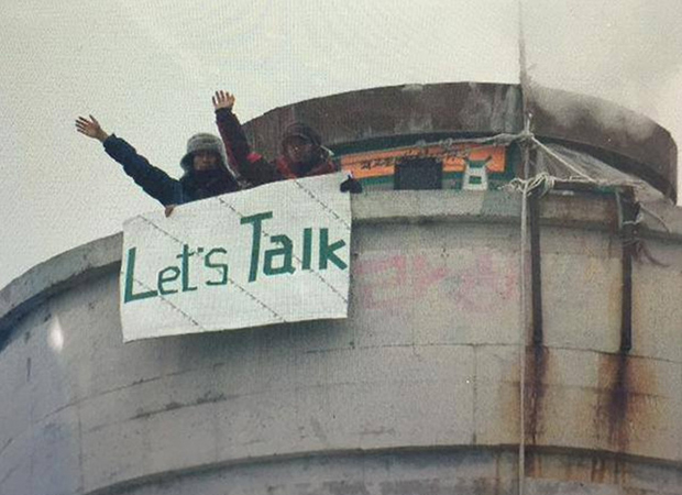 메시지를 적어 손을 흔들고 있다. [사진출처: 한겨레]