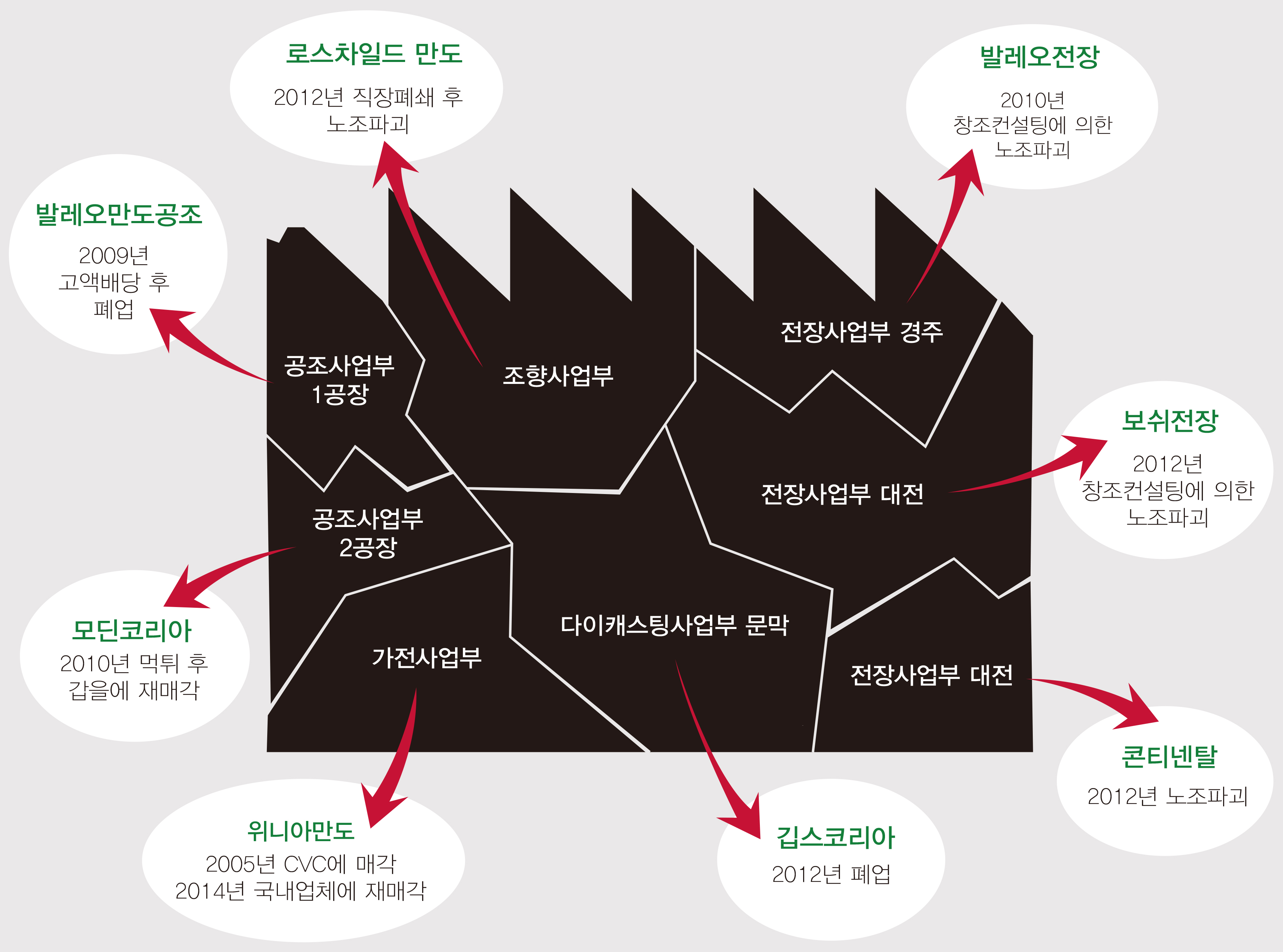 딤채로 유명한 위니아만도 역시 사모펀드가 회사를 쑥대밭으로 만든 대표적 사례다. 1999년 만도기계에서 분리된 위니아만도를 UBS캐피탈 컨소시엄이 인수한다. UBS컨소시엄은 위니아만도 자산을 담보로 대출을 받아 자금을 마련한다. 인수자금 2350억 원 중 1400억 원을 대출로 마련했다. 그런데 인수와 동시에 대규모 구조조정이 시작됐다. 노동조합을 무력화시키고 매각 가치를 높이기 위해서다. 대규모 해직, 임금동결, 상여금 반납이 이어졌다.