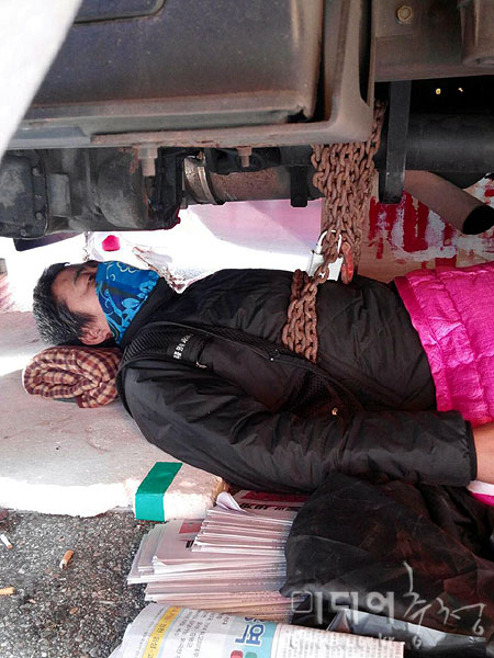 화물차량 아래 쇠사슬로 몸을 묶고 농성을 하기도 했다.