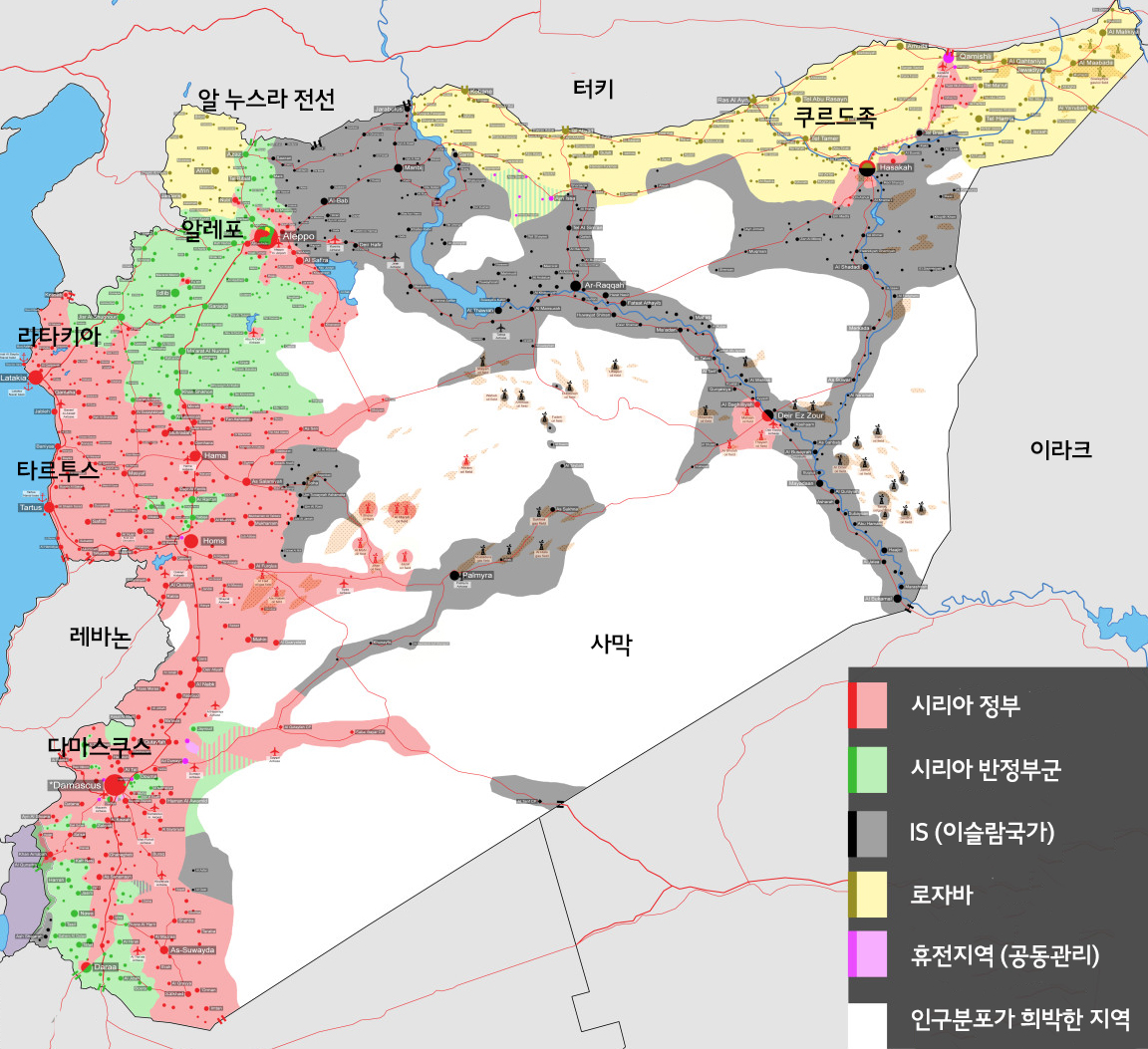 3개 세력 중 어느 누구도 결정적 승리를 거두지 못한 채 내전은 교착상태에 빠져 있다. 그러나 내전이 더욱 복잡한 양상을 보이는 것은, 이들 3개 세력의 싸움에 외부 강대국들의 이해관계가 겹쳐지기 때문이다. 미국과 러시아가 연이어 개입하면서 내전은 강대국 간 대리전의 양상으로까지 번지고 있다.