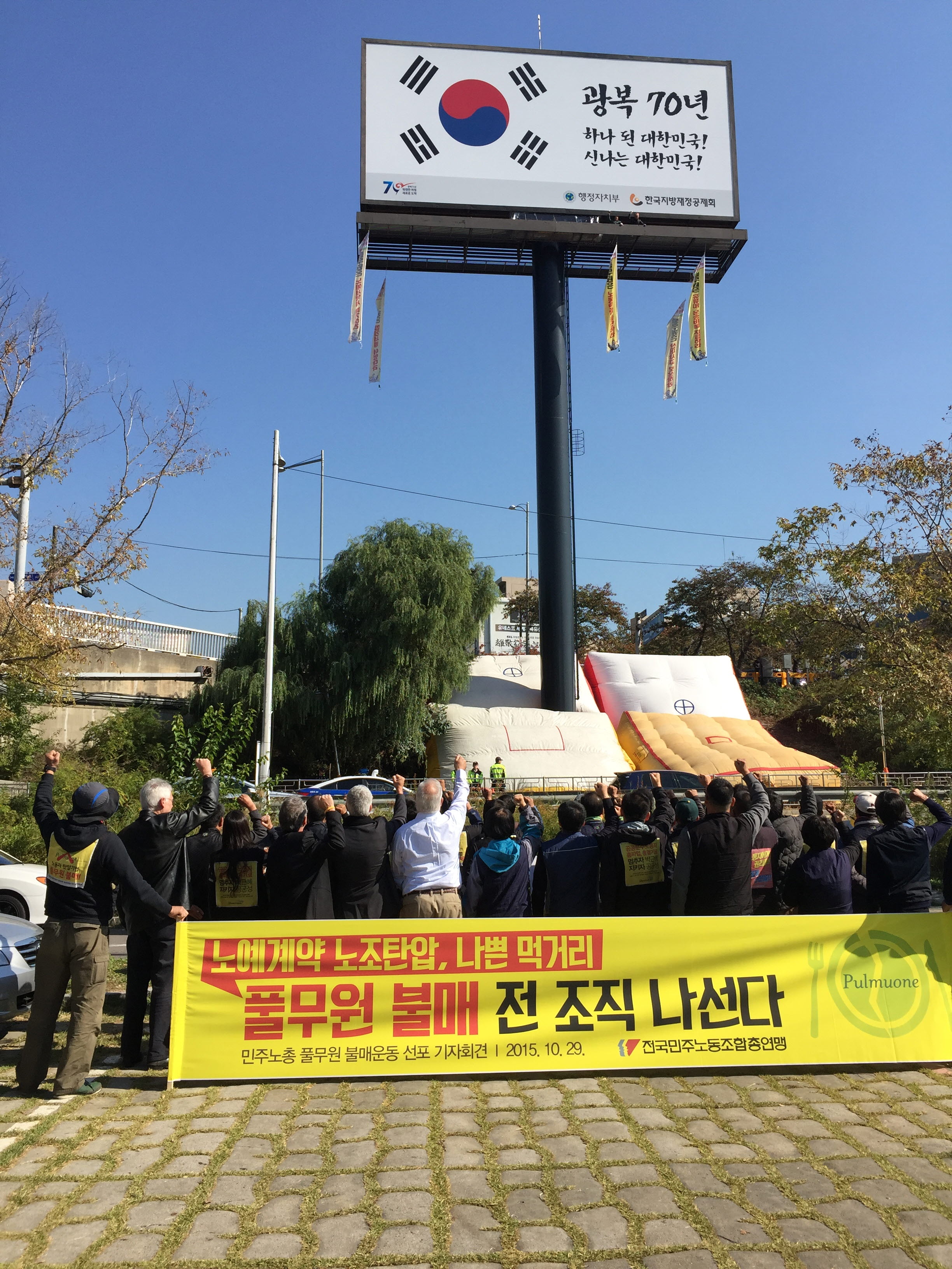 지난 9월 4일 공공운수노조 화물연대본부 소속 풀무원 화물노동자들이 전면 파업에 돌입했다. 이들은 노예계약서(도색유지서약서) 폐기, 노사합의 이행, 노동탄압 중단 및 화물연대 인정, 산재사고 보상 등을 요구하고 있다. 10월 24일에는 조합원 2명이 국회 앞 광고탑에 올랐고, 한 달 가까이 고공농성을 이어오고 있다.