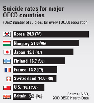 오늘 하루 38명이 스스로 목숨을 끊었다. 통계청이 발표한 ‘2014년 사망 원인 통계’에 따르면 지난해 자살로 사망한 사람은 1만 3836명이다. 한 달 1153명, 일주일 265명, 하루 38명 꼴이다. 자살률은 11년째 OECD 국가 1위이다. 2011년을 기준으로 한국의 자살률은 OECD평균보다 2.7배나 높다. 1990~2006년 동안 OECD 국가의 자살사망률은 평균 20퍼센트 감소한 반면 한국에서는 235퍼센트(10만 명당 1990년 9.8명→2006년 23명)가 증가했다. 자살률은 1997년 외환위기를 전후로 급격히 늘기 시작했다. 특히 65세 이상의 노년층의 자살률이 10만 명당 80명에 육박하고 75세 이상 자살률은 OECD 평균의 4배를 보여주고 있다.