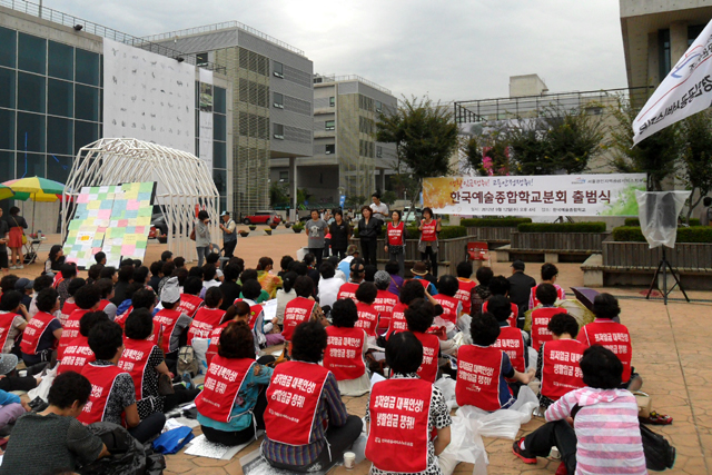 “우스갯소리로 그래요. 당시 홍익대 이사장이 없었더라면 우리 전략조직화 사업과 집단교섭이 탄력 받지 못했을 거라고. 홍대 투쟁을 거치면서 조직이 엄청나게 확대되었어요. 일단 사회적으로 많이 알려지다 보니까 여러 대학에서 노조 만들고 싶다는 상담이 들어왔구요. 인근에 있는 대학 분회들이 큰 자신감을 얻어서, 홍대 투쟁 끝나고 바로 이어서 연세대분회가 32일 동안 파업을 진행했어요. 바로 이게 최초의 집단교섭 파업이었어요. 그 힘으로 집단교섭을 성사시켰죠.”