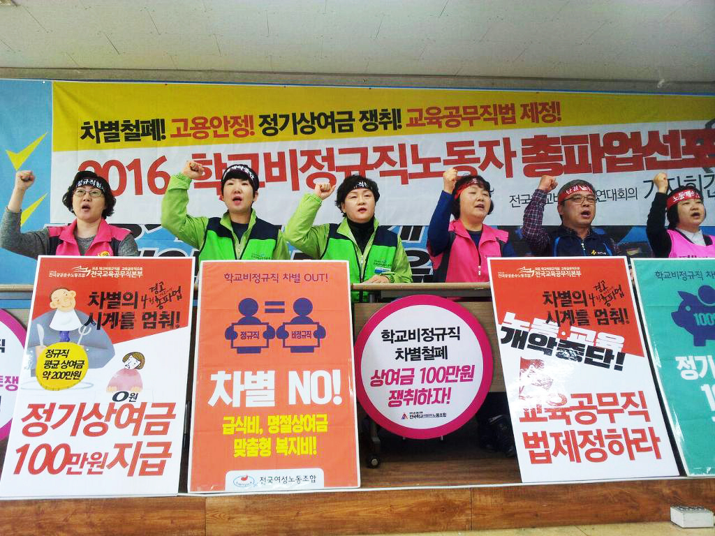 노동조합이 생기면서 조금씩 차별을 개선하고 있지만 갈 길이 멀다. 당장 올해만 봐도 학교비정규직의 기본급 인상률은 3퍼센트로, 정규직의 본봉인상률(9급 1호봉) 4.96퍼센트에 크게 못 미친다. 30만 원에 불과한 명절휴가비 상향조정을 제외하면 상여금 및 각종 수당에서의 차별개선 방안도 보이지 않는다. 게다가 교육부와 시·도교육청은 교육재정 악화를 이유로 고용을 위협하고, 차별문제를 해소하기는커녕 처우개선에 대해 애당초 했던 약속조차 어기고 있다. 이런 상황에서 학교비정규직 노동자들이 다시 머리띠를 맨 것이다.