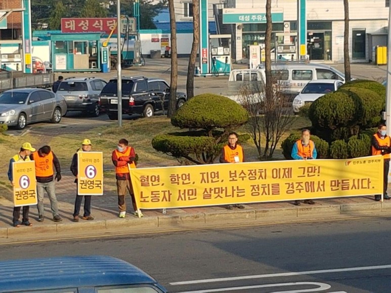 나는 민주노총 경주지부 조직부장으로 있으면서 3월초부터 권영국 후보 선거운동에 일손을 보태게 되었다. 그동안 권영국 후보가 경주시민들을 만나러 부단히 뛰어다닌 덕분에 용산참사의 진상과 김석기의 악행이 조금씩 경주에 알려지고 있는 것 같다. 물론 경주를 포함한 대구·경북은 수도권과 다르게 철거민 투쟁에 대한 사회적 경험이 거의 없다보니, 경주 어르신들 사이에서는 ‘김석기가 참전용사들 죽였다매’라는 식으로 소문이 돌아 속상하기도 했다.