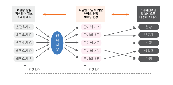 전력산업은 생산-유통-판매로 나뉜다. 석탄·천연가스·핵연료를 이용하여 전력을 생산하는 발전부문은 한전의 6개 자회사와 민간기업들이 경쟁하는 상황이다. 생산된 전기를 가정이나 공장 등 소비처로 보내는 송·배전과 이를 판매하는 일은 한전이 독점하고 있다. 즉 생산은 6개 공기업과 민간기업이 경쟁하지만, 발전소에서 생산된 전력의 도매 구매와 유통, 소매 판매는 한국전력이 독점하고 있는 구조인 것이다.