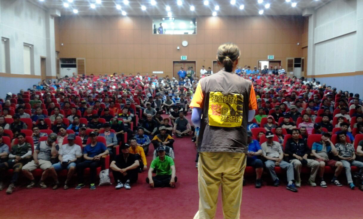 “현장에 새벽 5시 반까지는 가요. 도착해서 노동가요를 틀어놓죠. 현장 노동자들이 너무 이른 시간이라 아침을 먹고 출발할 수가 없어서 일단 현장에 오거든요. 그리고 함바식당(작업장 근처에서 운영하는 간이식당)에서 아침을 먹죠. 그게 보통 6시에서 6시 반 사이에요. 6시 반이 되면 마이크 잡고 이야기를 해요. 건설노동자들에게도 헌법에 보장해놓은 노동3권이 있다, 노동3권을 실현하게 되면 현장은 얼마든지 바꿀 수 있다는 내용을 이야기해요. 작업 들어가기 전 아침 조회가 6시 40~50분 사이에 진행이 되거든요. 그러면 조회 시간에 대해서 문제제기하죠. 조회 시간도 노동 시간에 포함되어야 하는데, 15~20분씩 현장노동자들의 시간을 뺏어서 하는 거잖아요. 사용자 논리대로 돈으로 환산하면 노동자들은 불필요한 투자를 하고 있는 거죠. 조기 조회를 금지하고, 작업 시간 내에 조회를 포함시키라는 요구를 하죠. 이렇게 아침 선전전을 하고 나서 사무실로 출근해요. 다른 의미 있는 투쟁도 많았지만 이 새벽 집회가 사실은 가장 의미 있는 투쟁이죠. 새벽 집회 하면서 조직된 조합원들의 고용안정을 요구하고, 조합원들은 노동조건을 정한 상태에서 일을 하고. 이렇게 몇 년 진행하다보니까 조합원이 상당이 많이 늘었어요.”
