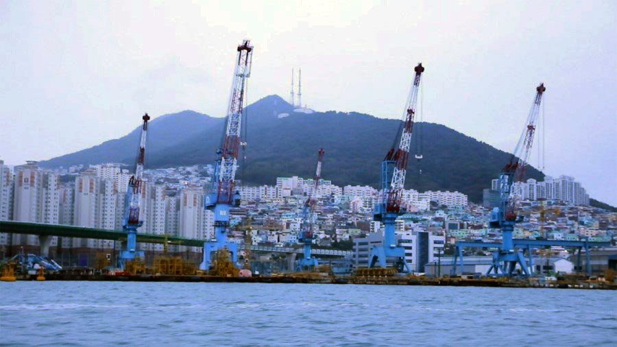 영화를 소개하는 자리에서 지난 기억들을 떠올린 것은 이 영화가 환기하는 역사가 바로 그것이기 때문이다. 한진중공업 노동조합(현 금속노조 한진중공업지회)을 다룬 다큐멘터리 <그림자들의 섬>은 부산 영도의 풍경을 보여주면서 시작한다. 높은 크레인이 듬성듬성 솟아있는 부둣가 공장. 언덕배기로 빽빽하게 들어찬 낮은 집들과 그 사이를 구불구불 굽이친 골목길. 2012년도에 희망버스를 한번이라도 탔던 사람들이라면 김진숙을 만나겠다며 새벽 내내 헤매던 그 길을 어렴풋이 떠올릴 것이다. 그렇게 영화는 부산의 한 작은 섬으로 우리를 다시 부른다. 하지만 영화가 말을 거는 방식은 희망버스 때의 들뜬 열기와는 달리 아주 차분하다.