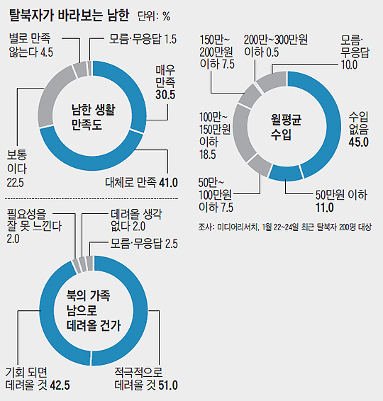 표에서 보듯이 탈북 이주민의 실업율은 일반 국민에 비해 두 배에 이르고 월 평균 소득은 65퍼센트에 지나지 않는다. 생계급여 수급율은 매우 높다. 즉 노동시장에서 제대로 된 일자리를 찾지 못하고 낮은 소득으로 인해 생활이 불안정하다. 2014년 북한이탈주민지원재단의 실태조사에 따르면 탈북 이주민의 3분의 2는 스스로를 하류층으로 생각한다. 이 조사에서는 낮은 경제활동 참가율, 높은 사회안전망 의존도, 청소년의 학교 부적응 등이 여전히 문제로 제기되었고 열악한 건강 상태로 인한 노동 의욕 저하, 학력과 경력의 단절, 남북한 직장 문화 차이, 사회적 편견 등이 주요 원인으로 분석되었다. 한국에서 좌절을 겪고 다시금 미국이나 캐나다, 유럽으로 향하는 탈남 현상이 지속되고 있기도 하다. 결국 노동시장으로의 안정적 편입, 사회적 인식의 차별 해소, 청소년 교육과 자립이 핵심 과제라고 할 수 있다. 정부 정책과 사회의 변화가 있어야 늘어나는 탈북 이주민의 권리와 사회적 지위도 높아질 수 있다.