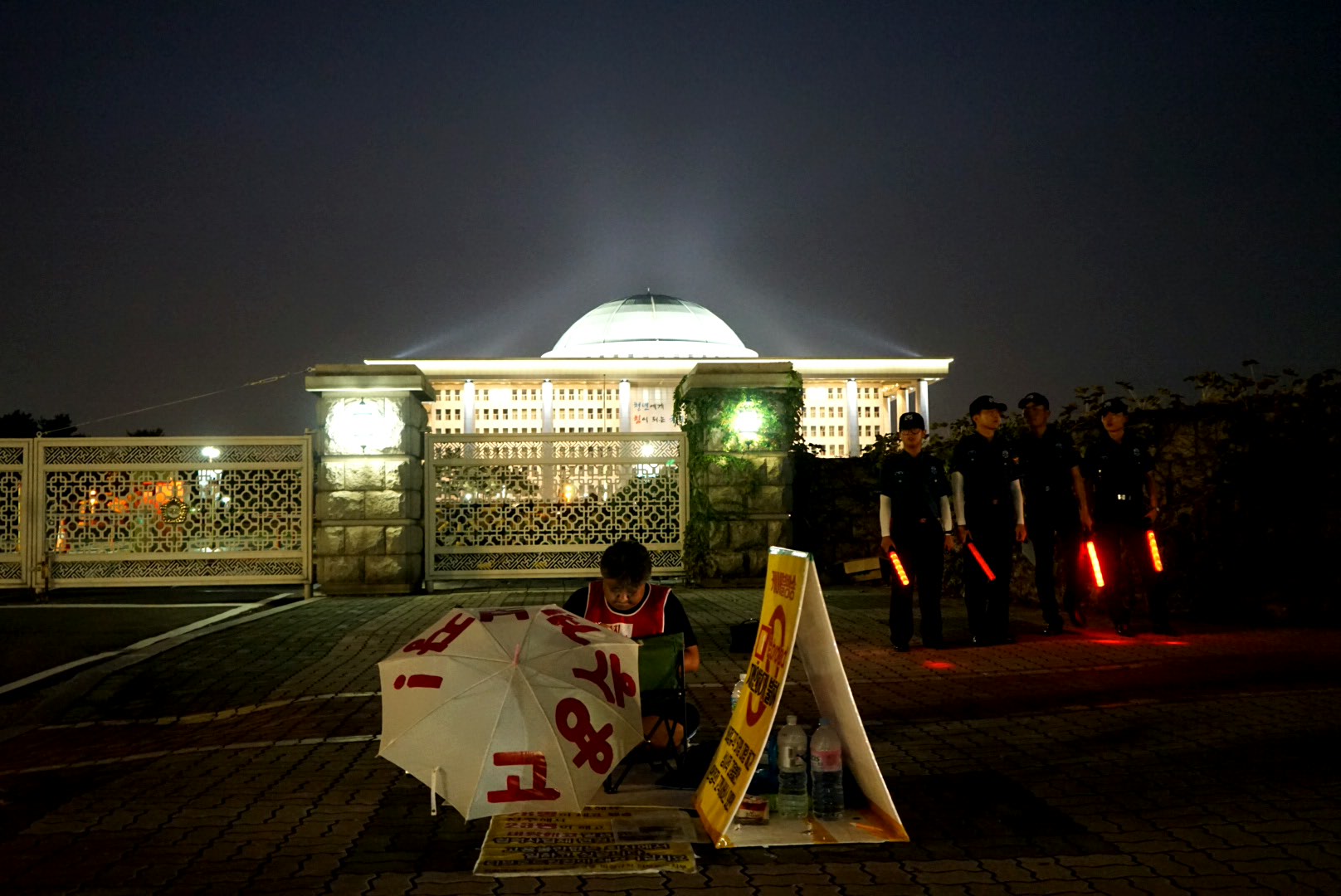 티브로드 해고자들의 국회 앞 농성장에는 이런 게 없다. 집회 신고가 불가한 구역(집시법에 따르면 국회의사당 반경 100미터 이내에서는 옥외 집회 또는 시위를 해서는 안 된다)이라는 이유로 사소한 물품도 경찰에게 제지를 당하기 때문이다. 담요마저 ‘불법 시위 용품’이라고 뺏어가는 통에 조촐한 살림살이만 갖춘 채 국회의사당역 출구의 자그마한 처마를 지붕 삼아 생활하고 있다. 한낮의 땡볕도, 몰아치는 비바람도 온 몸으로 받아내고 한반도를 발칵 뒤집어 놓은 지진도 맨땅에서 느끼면서.