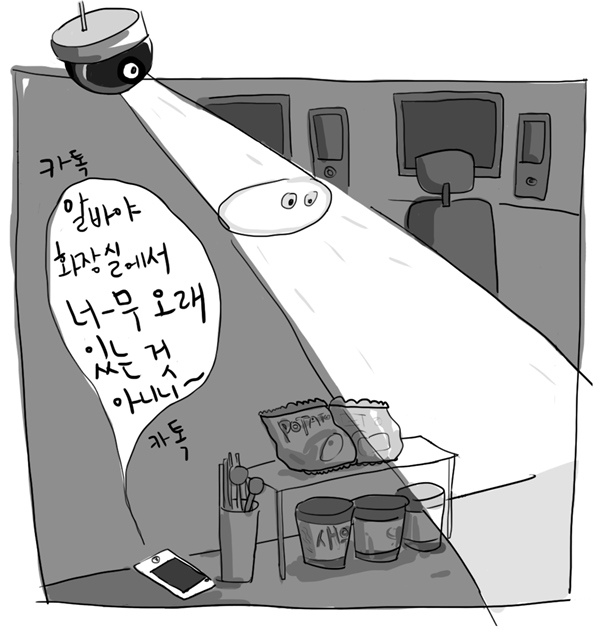 “사실 제가 여기 온 건 업무 스트레스 때문이에요. 일단 오버워치 뜨면서 손님 많아져서 일도 힘들어졌고요. 감시도 너무 심해요. 자정이나 새벽에 일하고 있을 때 사장이 종종 카톡을 보내요. 집에서 CCTV로 보고 있는거죠. 어쩔 땐 핸드폰으로도 보나봐요. ‘마스크는 왜 꼈냐’, ‘의자에 발 올리면 안 된다’, ‘손님 나갔으면 바로바로 안 치우냐’ 사사건건 감시해요. 하늘에서 일거수일투족 보고 있다는 생각이 들어 기분이 진짜 더럽고, 스트레스 받네요. 이런 건 어떻게 대처해요?”