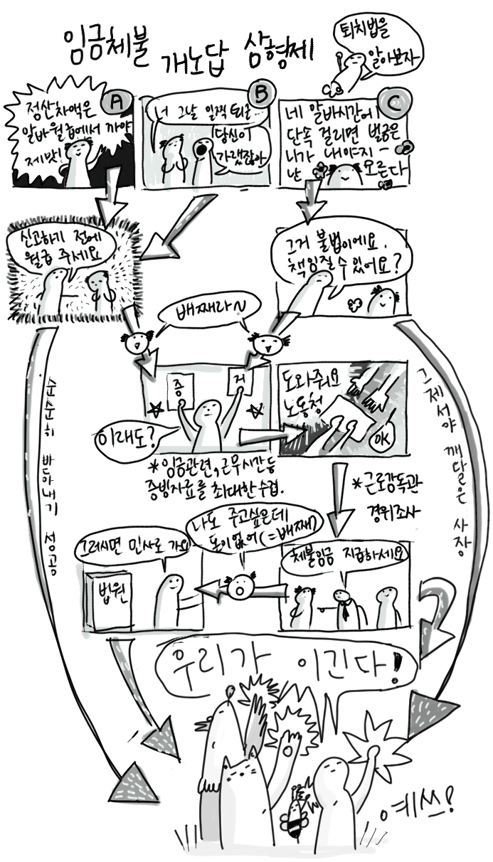 비둘기 맞아요! 그랬는데도 정산 차액을 빌미로 계속 월급을 뗀다? 천 원이라도 포기하지 말고, 대응하면 돼요. 노동청에 진정을 내는 방법도 있고, 끈질기게 매일매일 요구하고 문제제기하는 방법도 괜찮을 거 같아요. 떼인 월급 받아낸다는 게 사실 법적인 방법만 있는 건 아니거든요. 여기 있는 그림을 한 번 보세요! 빠져나갈 수 없을 걸? ●