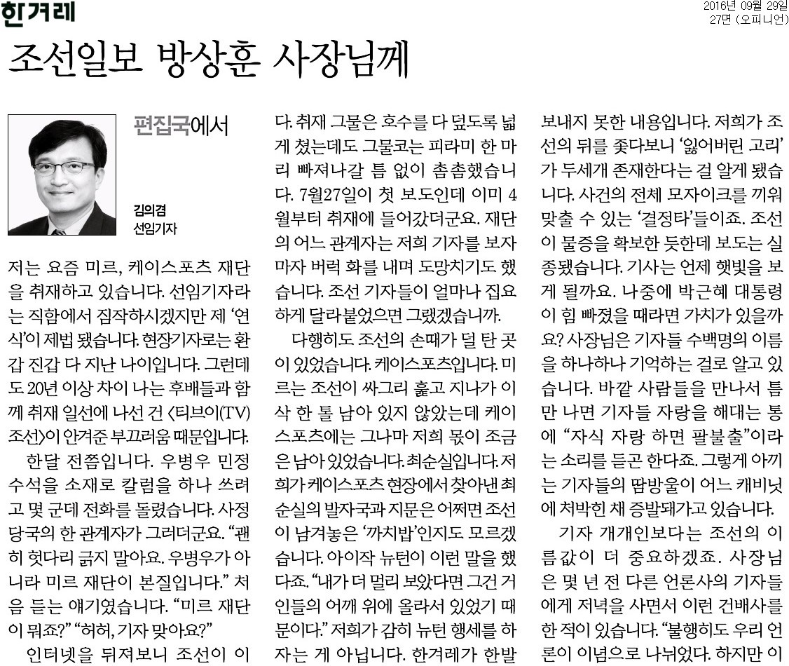 이후 <한겨레>가 K스포츠재단을 본격적으로 다룬다. 한 선임기자는 “K스포츠재단은 <조선일보>가 남긴 까치밥”이라는 표현과 함께 의미심장한 칼럼(9.28.)을 쓴다. 그는 “<조선일보>는 미르재단에 대한 모든 취재를 이미 마친 상태”라며, 아직까지 보도를 하지 않고 있는 이유를 묻는다. 치밀한 계획 하에 수많은 폭로가 이미 준비돼 있었음을 알 수 있는 대목이다.