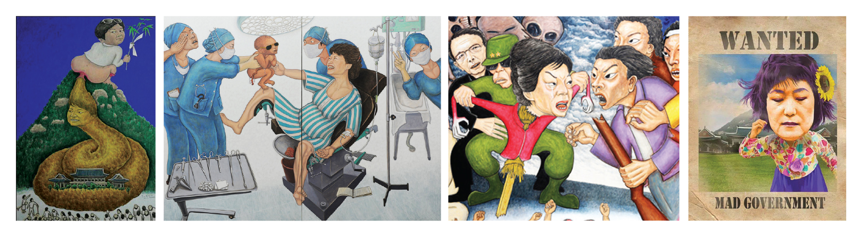 몇 해 전 그는 박근혜가 박정희를 출산하는 모습을 그린 적도 있다. 외압 때문에 전시에서 그림을 내려야 했던 화가로서는 억울하겠지만, 사실 남겨진 쟁점은 표현의 자유만이 아니다. 그가 계속해서 선보이는 그림들은 단순히 정치권력을 비판하는 그림이 아니라, 풍자에 대한 오해와 뿌리 깊은 여성혐오로 빚어진 왜곡상이기 때문이다.