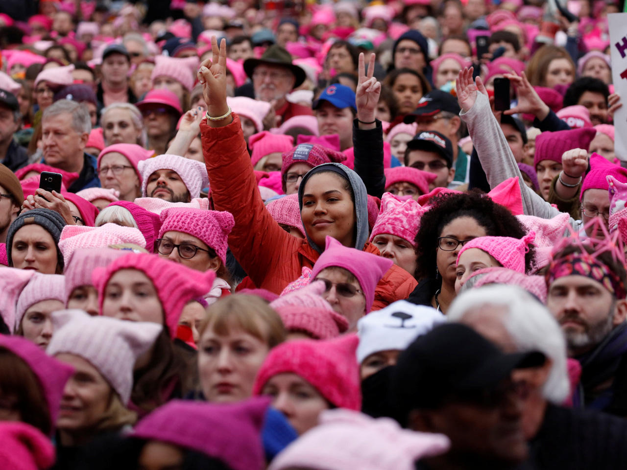 분홍색 털모자(푸시햇)를 쓰고 집회에 나왔다.