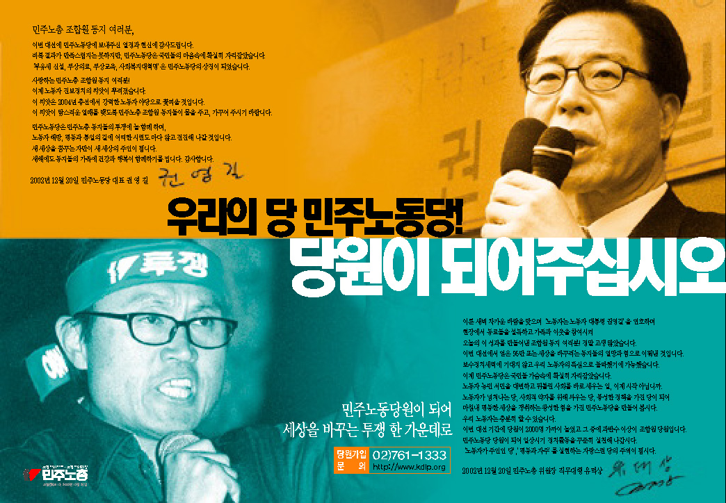 2000년에 공식 창당한 민주노동당은 민주노총의 결의와 지원을 통해 건설된, 노동자 정치세력화 운동의 대표적 산물이다. 창당 이후 민주노동당은 김대중-노무현 정권의 신자유주의 정책과 노동자운동 탄압, 이라크 파병 등을 비판하며 노동자들의 목소리를 대변하고 투쟁했다. 그 과정에서 성장을 거듭하여 창당 4년만인 2004년 총선에서 10명의 국회의원을 당선시키는데 성공한다. 하지만 역설적이게도 2004년 이후 노동자 정치세력화 운동은 후퇴를 거듭했다.