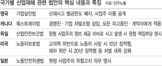 세월호 참사 발생 직후, ‘기업살인법’ 혹은 ‘기업처벌법’이라는 생소한 이름의 법이 종종 언론에 등장했다. 청해진해운이 돈벌이를 위해 증개축을 하고 과적을 일삼았다는 사실이 참사의 배경으로 지목되면서 기업의 안전책임을 획기적으로 높일 필요성이 제기되었기 때문이다. 본래 한국의 심각한 산재 사망을 줄이기 위한 대안으로 노동조합과 일부 사회단체들이 언급했던 이 법은, 304명의 소중한 생명을 잃고서야 다시금 진지하게 논의되기 시작했다.