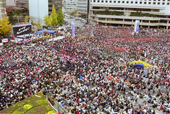 노동운동 탄압에서도 노무현 정부는 이전 정부에 뒤지지 않았다. 김영삼 정부와 김대중 정부 시기에는 각각 연평균 126명, 178명의 노동자가 구속되었다. 이에 비해 2003년 한해에만 196명의 노동자가 구속되었고, 이듬해에는 그 숫자가 337명으로 껑충 뛰었다. 노동자에 대한 손해배상 청구액은 2003년 10월 31일 기준으로 총 574억 원, 가압류 금액은 총 781억 원을 훌쩍 넘겼다. 손배가압류 역시 노동자들을 협박하여 투쟁을 제압하려는 것이었다. 노동운동의 정부에 대한 불신은 갈수록 깊어졌다. 그리고 11월, 민주노총은 격렬한 거리투쟁에 나선다. ●