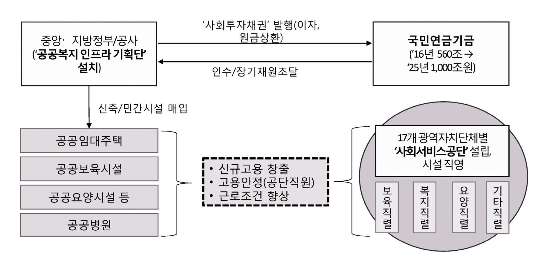 사회서비스공단은 사회서비스를 담당하는 시설을 지자체가 직접운영하고, 해당 노동자를 직접고용하는 구상을 담고 있다. 노무현 정부 때 본격화된 사회서비스 시장화에 대한 노조와 사회운동의 지속적 요구와 일맥상통하는 측면이 크다.