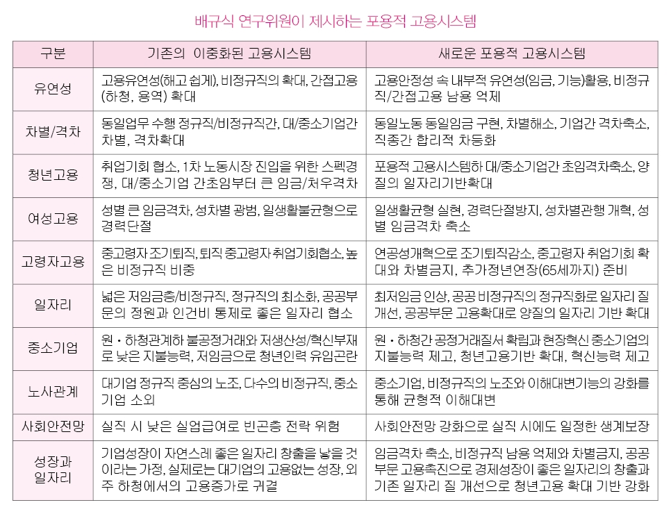 문재인 정부 고용 정책 수립에 깊숙이 개입해 온 배규식 노동연구원 연구위원은 ‘포용적 고용시스템’을 노동시장 개혁의 새로운 대안으로 제시하고 있다.(아래 표 참고) 노동시장의 유연화 과정에서 지나치게 분절화, 파편화, 이중구조화된 구조를 개혁하여 ‘포용적 고용시스템’을 구축하는 것을 목표로 하고 있다.