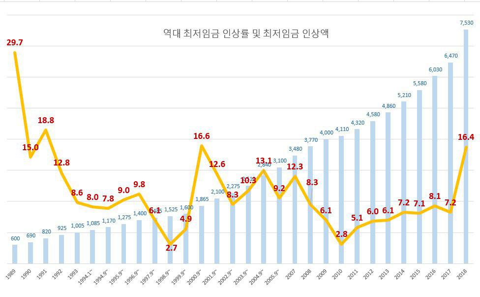 노동자들이 올해 최저임금 인상분에 놀라는 이유는 이 만큼의 인상이 최저임금을 받는 노동자들에겐 불가능할 것이라 여겼기 때문이다. 한 번도 10만 원 이상 기본급이 올랐던 적이 없었기 때문이다.