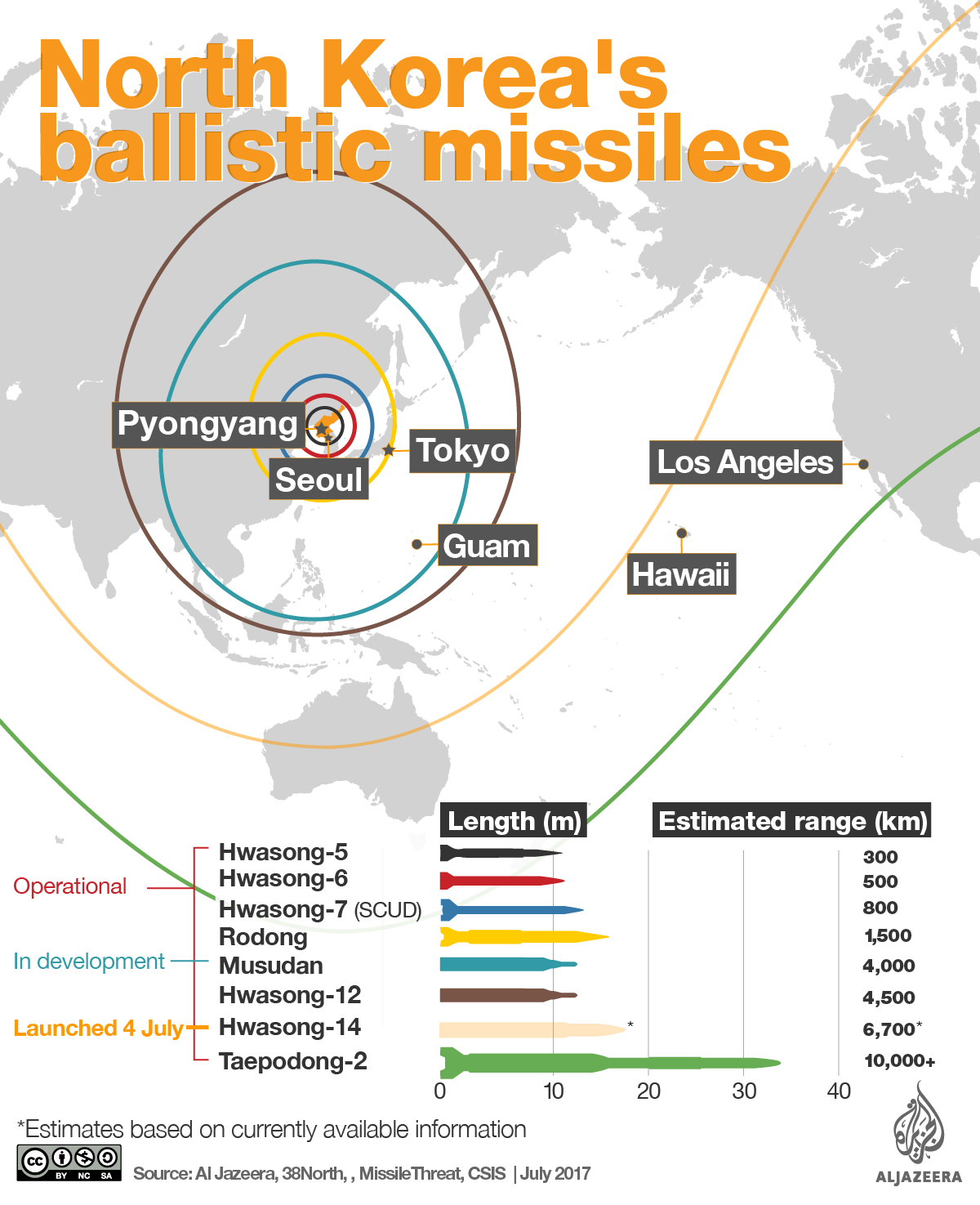 이른바 ‘8월 위기설’은 7월 29일 북한의 화성-14형 발사로 점화됐다. 국내외 보도와 분석에 따르면, 이날 발사된 화성-14호는 최대고도 3700km까지 상승해 거리 998km를 날아갔다. 사거리가 9000km~1만km에 달하는 ICBM(대륙간 탄도 미사일)으로 추정된다. 발사 위치를 기준으로 뉴욕이 1만500km, 워싱턴디씨가 1만800km 떨어져 있으니 헐리우드 한복판은 물론 미국 전역을 타격할 수 있는 셈이다.