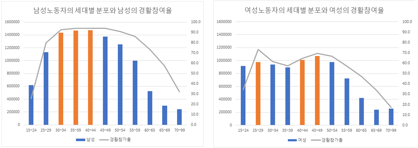 남성 노동자를 세대별로 보면, 30대가 290만 3천 명으로 가장 많다. 30대 후반보다는 40대 초반이 3천 명 많지만 경제활동 참가율은 30대 후반이 94.1퍼센트로 0.3퍼센트포인트 더 높다. 여성노동자의 경우는 40대가 가장 많다. 20대 후반 경제활동 참가율은 73.2퍼센트로 전 세대 중 가장 높다. 30대는 임신·출산 및 육아로 참여율이 하락하는 전형적인 M자형 곡선을 그린다. 하지만 57.4퍼센트가 경제활동에 참여하고 있다. (표2)
