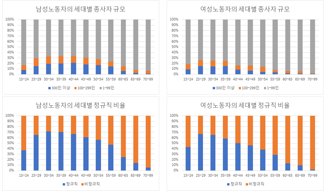 이상을 종합해보자. 남성의 경우 30대~40대 초반이 상대적으로 안정적이고, 큰 규모의 사업장에서 일하고 있다. 여성의 경우 20대 후반이 상대적으로 안정적이고, 큰 규모의 사업장에서 일하고 있다. 25~40세 청년노동이 한국 노동시장의 중심에 위치하고 있는 것이다.