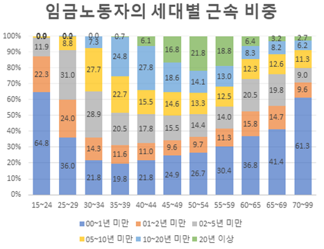 직업 경력이 짧은 만큼 청년 노동자의 평균 근속기간은 중고령 노동자에 비해 짧다. 하지만 근속 1년 미만 초단기 근속자 비중은 30대가 가장 낮다. 그만큼 다른 세대에 비해 상대적으로 안정적인 일자리를 갖고 있는 것이다.