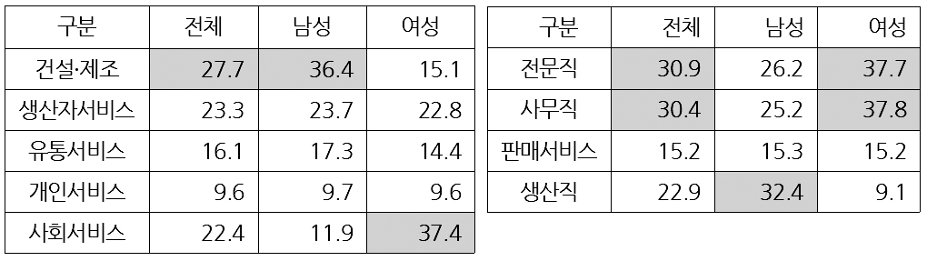 직종별로 보면, 청년 노동자 대다수가 기술전문직(30.9퍼센트), 사무직(30.4퍼센트)이다. 하지만 성별로 보면 양상이 크게 달라진다. 청년 남성은 32.4퍼센트가 생산직이고, 여성은 37.8퍼센트가 사무직, 37.7퍼센트가 전문직이다. 그에 비해 생산직은 9.1퍼센트로 낮다.